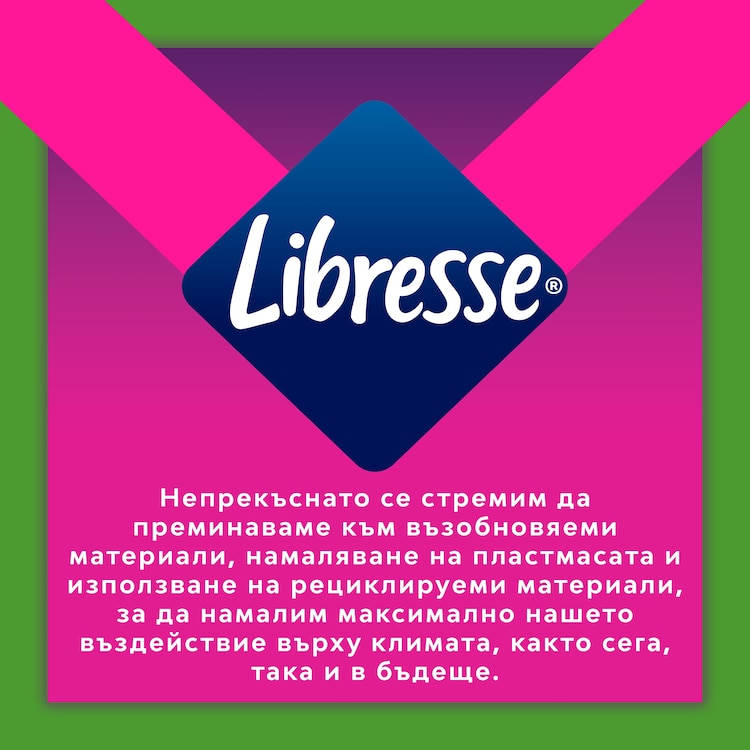 Libresse се гордее с грижата за жените назависимо от формите на тяхото тяло и света около тях. С мисъл за околната среда, непрекъснато се стремим да преминаваме към възобновяеми материали и установяваме практики за намаляване на пластмасата и използването на рециклируеми материали. Целта ни е да се намалят максимално отпадъците и въздействието върху климата, както сега, така и в бъдеще.